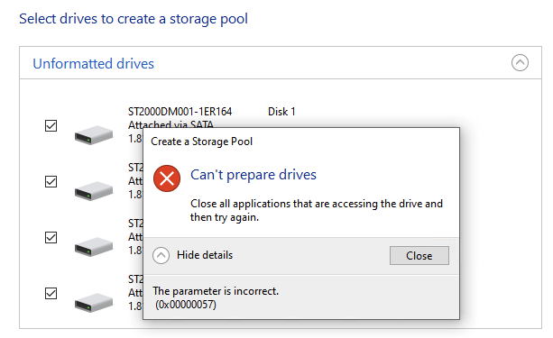 I’m not sure if this is due to system in question being in the insider fast ring (Build 19041 version 10.0.19041), however when trying to create a storage space via the GUI I got the following error: