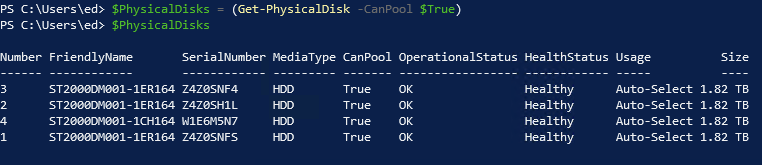 $PhysicalDisks = (Get-PhysicalDisk -CanPool $True)