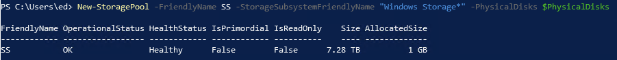 New-StoragePool -FriendlyName SS -StorageSubsystemFriendlyName "Windows Storage*" -PhysicalDisks $PhysicalDisks