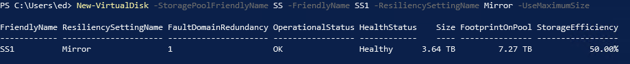 New-VirtualDisk -StoragePoolFriendlyName SS -FriendlyName SS1 -ResiliencySettingName Mirror -UseMaximumSize