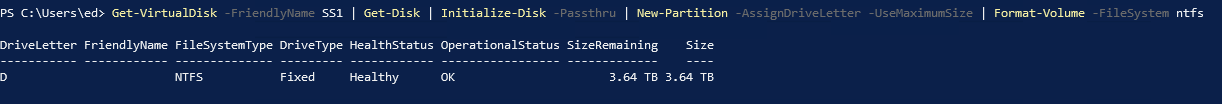 Get-VirtualDisk -FriendlyName SS1 | Get-Disk | Initialize-Disk -Passthru | New-Partition -AssignDriveLetter -UseMaximumSize | Format-Volume -FileSystem ntfs