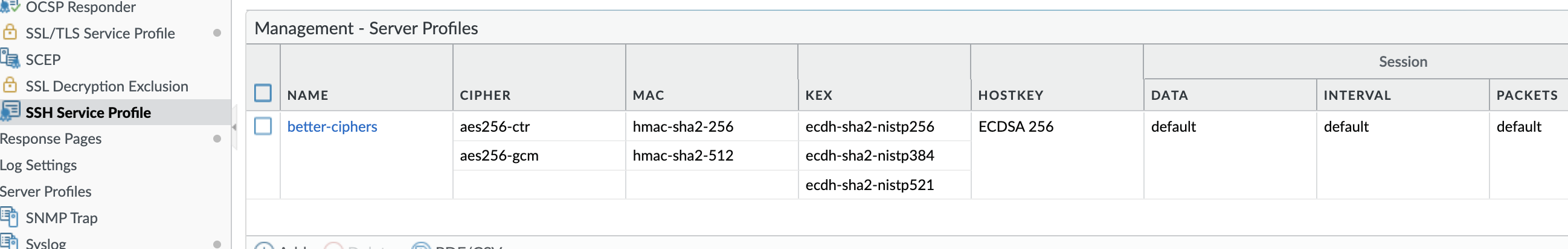 set deviceconfig system ssh profiles mgmt-profiles server-profiles better-ciphers kex ecdh-sha2-nistp256