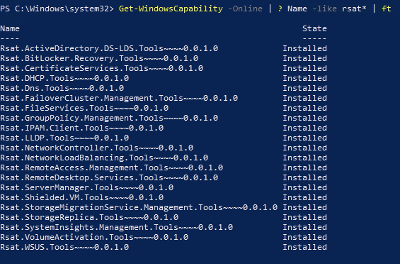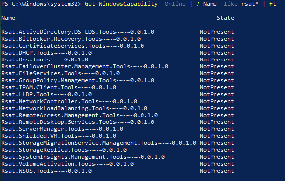 Get-WindowsCapability -Online | ? Name -like rsat* | ft